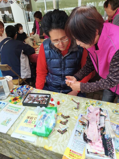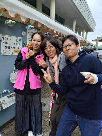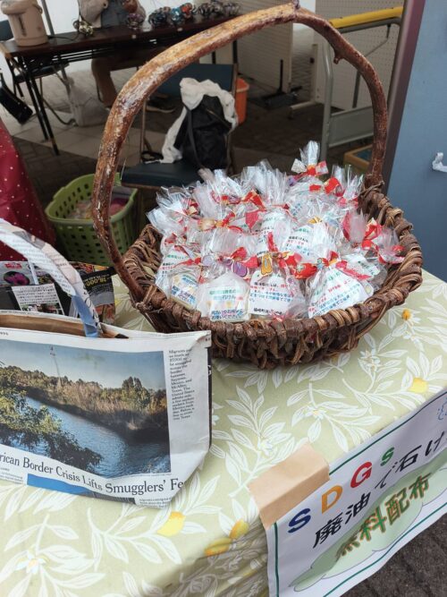 今年は廃油石鹸のプレゼントと、新聞エコバッグと箸置きのワークショップをしました。